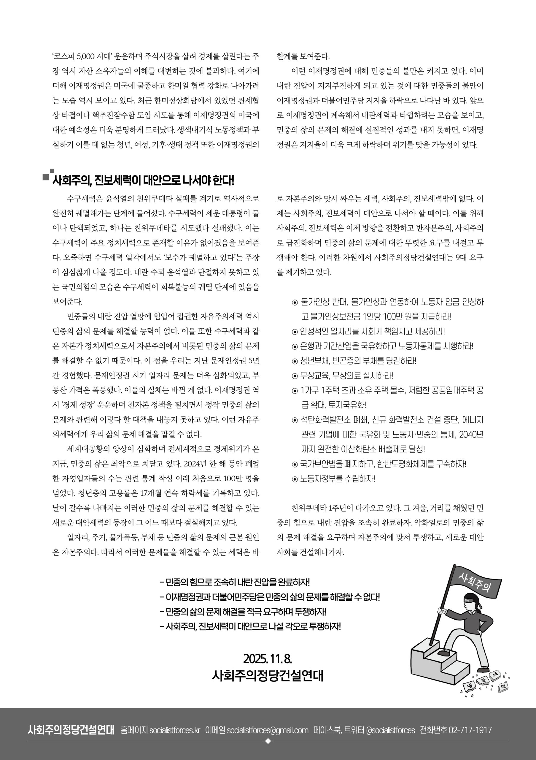세계대공황의 양상이 심화하며 전세계적으로 경제위기가 온 지금, 민중의 삶은 최악으로 치닫고 있다. 2024년 한 해 동안 폐업한 자영업자들의 수는 관련 통계 작성 이래 처음으로 100만 명을 넘었다. 청년층의 고용률은 17개월 연속 하락세를 기록하고 있다. 날이 갈수록 나빠지는 이러한 민중의 삶의 문제를 해결할 수 있는 새로운 대안세력의 등장이 그 어느 때보다 절실해지고 있다.
