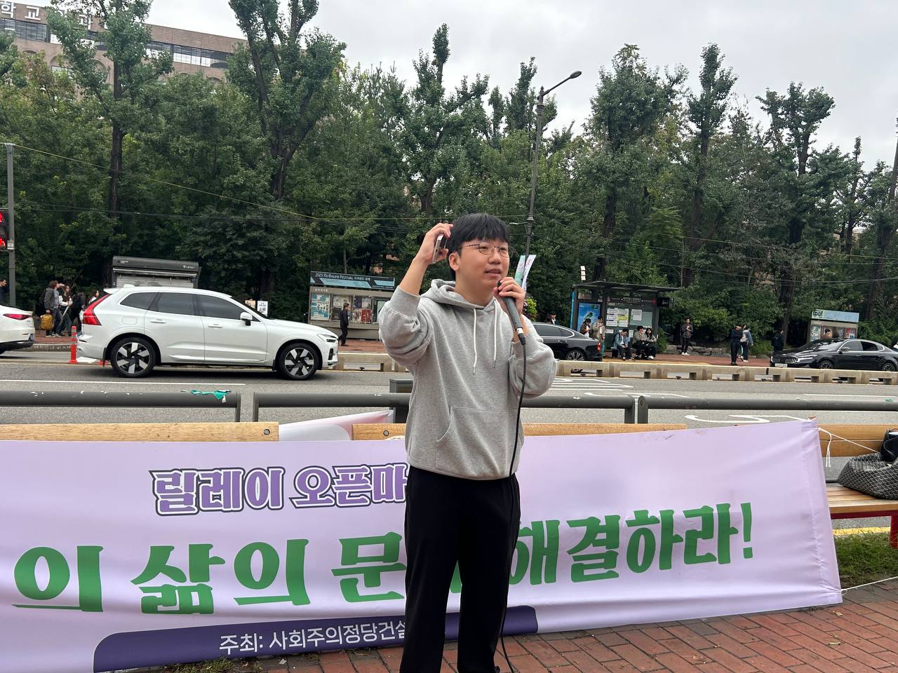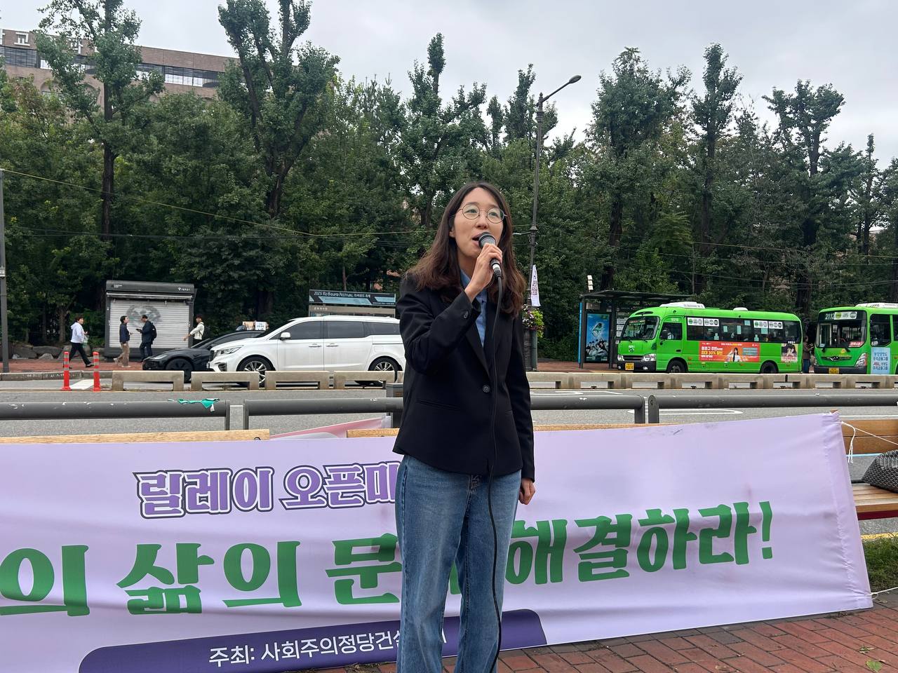 갈수록 악화되고 있는 여성들의 삶의 문제를 이제는 여성들이 직접 나와 이야기하고, 당당하게 해결을 요구하자는 취지에서 출발했던 사회주의정당건설연대 주최 “여성들의 삶의 문제 해결하라! 릴레이 오픈마이크”의 4회차는 10월 18일 혜화역 인근에서 진행되었다. 마지막 회차인 만큼 ‘여성들의 삶의 전반’을 주제로 진행되었고, 사회주의정당건설연대 여성해방운동형성사업팀 팀원인 이석훈 동지가 사회를 맡았다. 마지막 회차의 생생한 현장 분위기가 담긴 발언 영상은 사회주의정당건설연대 페이스북에 게시될 예정이며, 매체 『사회주의자』에는 지금까지 진행된 1~4회차의 보다 자세한 내용을 한 번에 엮은 오픈마이크 후기 기사가 실릴 예정이다.
