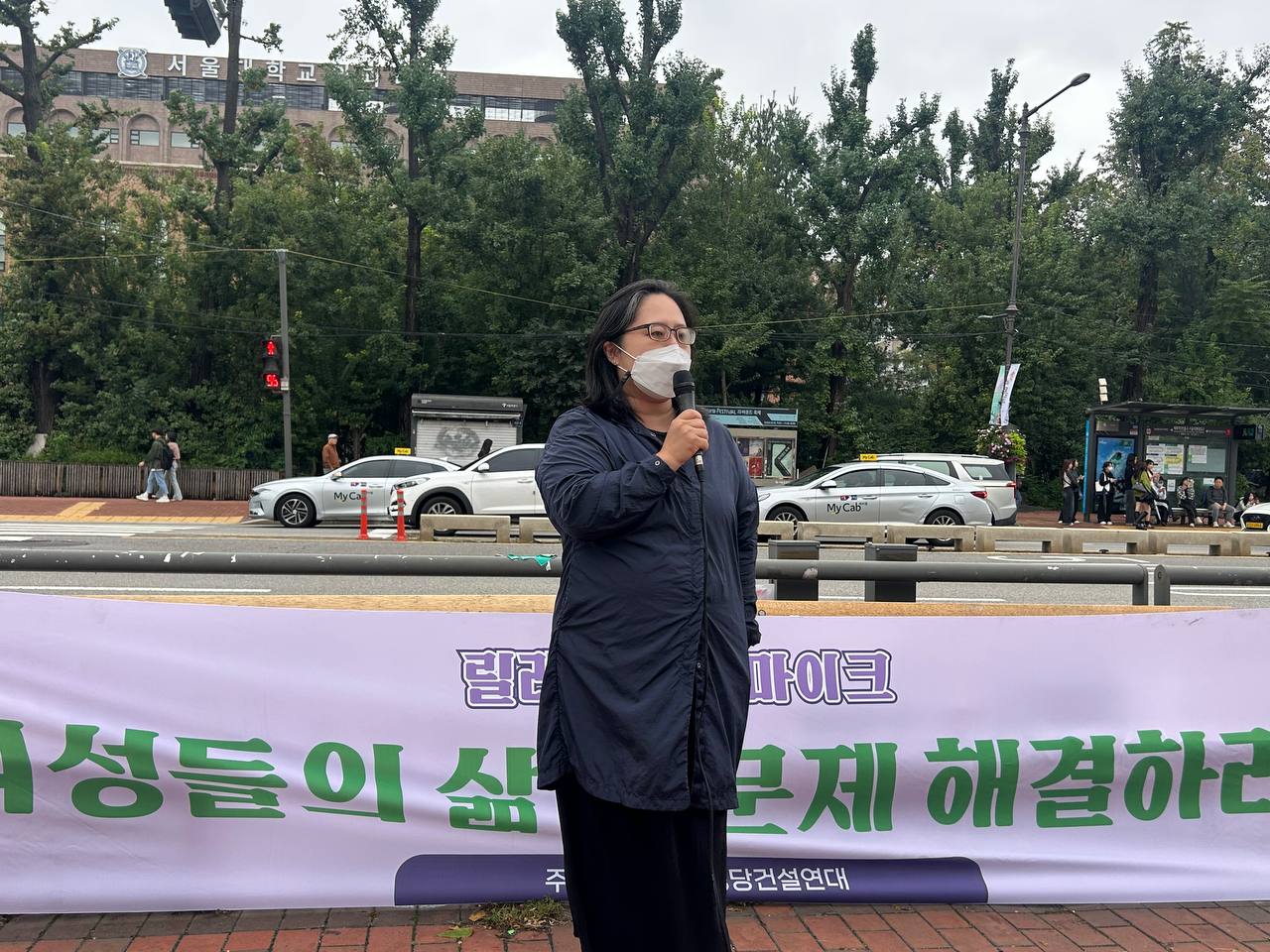 여는 발언. “여러분 여성들의 삶의 문제를 악화시키는 주범이 무엇인지 한번 생각해 보았으면 좋겠습니다. … 이제 한국의 여성해방 운동도 자본주의를 문제 삼는 방향으로 급진화되어야 합니다.”―사회주의정당건설연대 여성해방운동형성사업팀 김민재 팀장